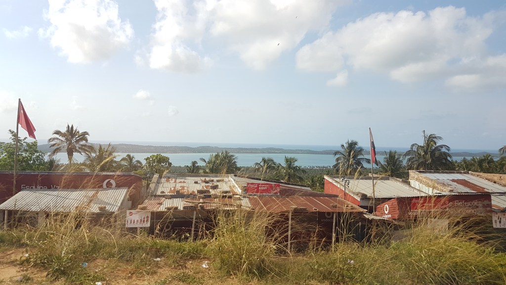 Everyone (mostly) adheres to the speed limit, and the scenery is pleasant. Along the road, there are stalls which sell cashew nuts, peri peri sauce, coconuts and crafts. Toilets at petrol stations are clean and well looked after. The road is mostly away from the immediate coast, and the only clue one has of getting near the sea, is that the red sand on the side of the road changes to white sand. The glimpses of the sea are those of travel brochures: turquoise and gorgeous.