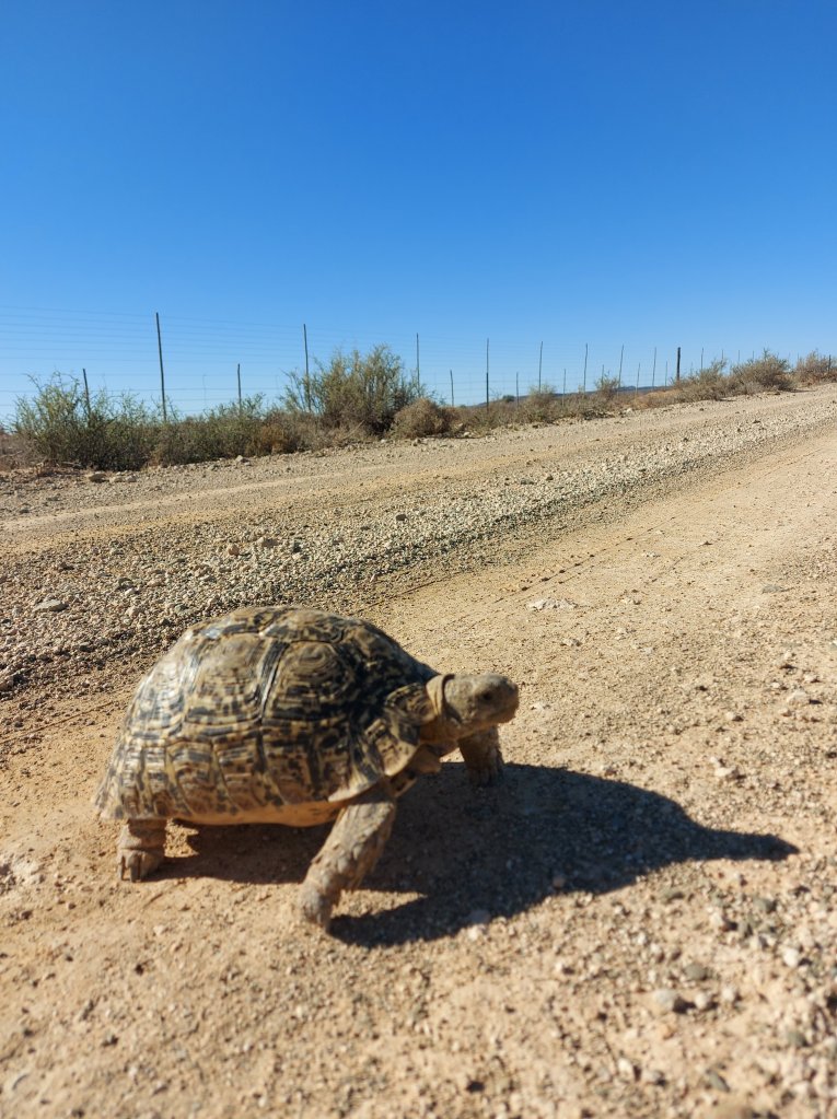We saw dozens of the (now) ubiquitous Springbok, the odd (I think) Grysbok, plenty of tortoises, all intent on crossing the road. Why did the tortoise cross the road? Dunno – to me it looked pretty much the same on both sides. There were plenty of Springhares (Pedetes capensis) too – unfortunately all dead. Despite the name, with their long back legs, which make them kangaroo-like, Springhares are not related to hares or rabbits. They are mostly nocturnal, and not too clever – they unsuccessfully try do their amazing jumps in front of vehicles at night, getting blinded by the headlights. The result: every few kilometres there was another squashed springhare roadkill.